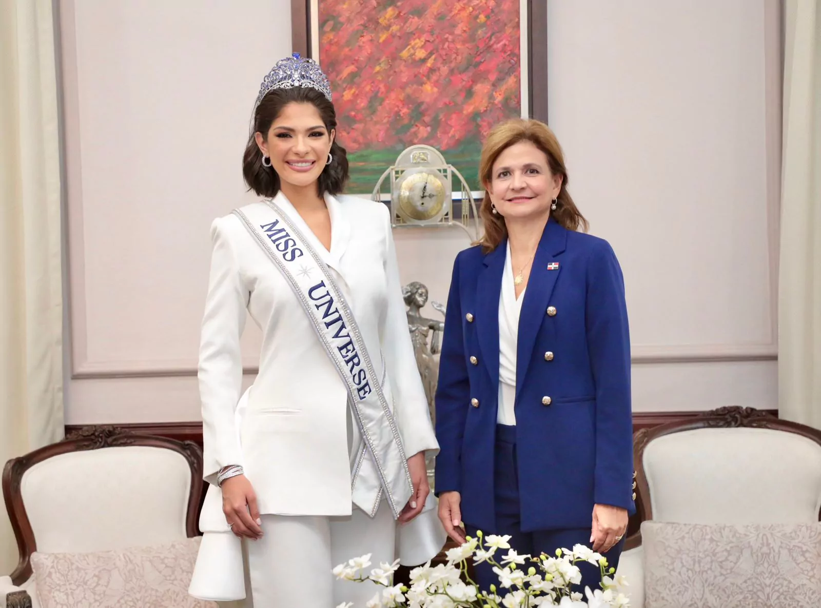 La vicepresidenta Raquel Peña recibió este martes en su despacho la visita de Miss Universo 2023, Sheynnis Palacios, y Miss República Dominicana 2024, Celinee Santos.